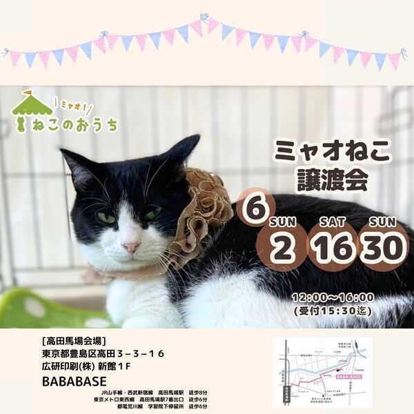 | イベント内容 | 参加する保護猫ちゃんはホームページが最速で更新されます。 およそ譲渡会一週間程前よりホームページにてご確認いただけます。 https://myaoneko.com/cats/ 事前予約はできません。 猫ちゃんをお世話することになるご家族皆様でお越しくださると嬉しいです。 譲渡会場でお会いしましょう♪ 会場にて、以下の点をお願いをしております。 ✿手指消毒 猫さん感染症対策のため、入場時や猫さんと触れ合う際には手指消毒をお願いしております。 御来場者多数の場合には入場制限を設けさせていただきます。 ※当日沢山のご来場者様がいらっしゃった場合、整理券をお渡しする事がございます。 ※混雑状況によって、予定より早く受付終了となることがあります。 何卒ご了承ください。 会場内外で長時間お待たせする場合もございますが、ご理解くださいますようお願い致します。 結果のご連絡は、当日夜〜翌日夜までの間に、お電話もしくはメールにて保護主より直接ご連絡いたします。 ◇譲渡に関してのお願い 【ミャオ!ねこのおうち】では譲渡に際して、以下の要件をお願いしております。 ・完全室内飼いで終生愛育 ・脱走させないための対策 ・不妊去勢手術 ・譲渡誓約書の取り交わし ・医療費の一部ご負担 ※60才以上の方のみのご家庭、独身や、経済的に困難な世帯、 必要な脱走対策を施していただけない方には原則的に譲渡はご遠慮頂いております。 また、保護主により譲渡条件が異なる場合もございますので会場でご相談ください。 参加予定ねこちゃんは、急な体調不良などで不参加になる場合もございます。 譲渡に際してはさまざまなお願いがございます。 【譲渡に関してのお願い】・【医療費の一部のご負担】・【譲渡までの流れ】など 詳しくは下記ホームページをご覧くださいますよう宜しくお願い致します。 ミャオ!ねこのおうち ホームページ https://myaoneko.com |