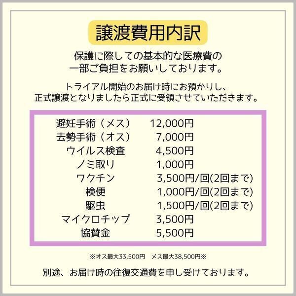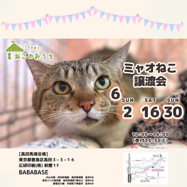 | イベント内容 | 参加する保護猫ちゃんはホームページが最速で更新されます。 およそ譲渡会一週間程前よりホームページにてご確認いただけます。 https://myaoneko.com/cats/ 事前予約はできません。 猫ちゃんをお世話することになるご家族皆様でお越しくださると嬉しいです。 譲渡会場でお会いしましょう♪ 会場にて、以下の点をお願いをしております。 ✿手指消毒 猫さん感染症対策のため、入場時や猫さんと触れ合う際には手指消毒をお願いしております。 御来場者多数の場合には入場制限を設けさせていただきます。 ※当日沢山のご来場者様がいらっしゃった場合、整理券をお渡しする事がございます。 ※混雑状況によって、予定より早く受付終了となることがあります。 何卒ご了承ください。 会場内外で長時間お待たせする場合もございますが、ご理解くださいますようお願い致します。 結果のご連絡は、当日夜〜翌日夜までの間に、お電話もしくはメールにて保護主より直接ご連絡いたします。 ◇譲渡に関してのお願い 【ミャオ!ねこのおうち】では譲渡に際して、以下の要件をお願いしております。 ・完全室内飼いで終生愛育 ・脱走させないための対策 ・不妊去勢手術 ・譲渡誓約書の取り交わし ・医療費の一部ご負担 ※60才以上の方のみのご家庭、独身や、経済的に困難な世帯、 必要な脱走対策を施していただけない方には原則的に譲渡はご遠慮頂いております。 また、保護主により譲渡条件が異なる場合もございますので会場でご相談ください。 参加予定ねこちゃんは、急な体調不良などで不参加になる場合もございます。 譲渡に際してはさまざまなお願いがございます。 【譲渡に関してのお願い】・【医療費の一部のご負担】・【譲渡までの流れ】など 詳しくは下記ホームページをご覧くださいますよう宜しくお願い致します。 ミャオ!ねこのおうち ホームページ https://myaoneko.com |