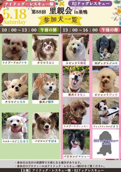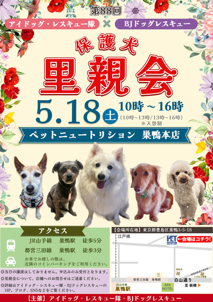 | イベント内容 | 第88回アイドッグ里親会(巣鴨)のお知らせ ※BJドッグレスキューとの合同里親会になります。 以下の通り、里親会を開催します。 ⭐️日時:5月18日(土) 10:00 ~ 16:00 ※入れ替え制 (10:00〜13:00/13:00〜16:00) ⭐️会場:ペットニュートリション巣鴨本店 東京都豊島区巣鴨3-5-18 ⭐️最寄駅 JR山手線 巣鴨駅より徒歩5分 都営三田線 巣鴨駅より徒歩3分 ※お車でお越しの際は、近隣のコインパーキングをご利用ください。 ⚠️会場内は密になりやすいため、マスクの着用は自己責任にてご判断お願いします。 ⚠️犬をお連れの方は、オムツやマナーベルトの着用をお願い致します。 フリーで遊ばせることは出来ませんので、リードの着用をお願い致します。 〜皆様のお越しをお待ちしています〜 |