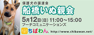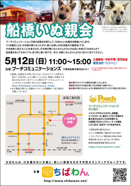 | イベント内容 | 5月船橋いぬ親会のご案内です。 poochさんのご厚意により、プーチコミュニケーションズ(船橋市駿河台)のドッグランをお借りして「船橋いぬ親会」を開催することになりました。 屋根付きのドッグランでの開催になります。 【ちばわんからのお願い】 ①会場内ではマスクの着用をお願いします。 ②発熱がある方や体調が悪い方は来場をご遠慮ください。 ③会場内が密にならないよう入場制限をさせていただく場合があります。 開催日:5月12日(日)11:00~15:00 屋外開催(屋根付きドッグラン) 小雨決行 場所:プーチコミュニケーションズ 千葉県船橋市駿河台2-9-1 【アクセス】 飯山満駅から徒歩約20分 JR東船橋駅から徒歩約20分 県道8号線 吹上交差点~駿河台交差点間にあるファミリーマートの裏手になります。 リサイクルショップとファミリーマートの間の道へ進み、最初のT字路を左折してください。 ※店舗の駐車場は5台分のみとなりますので混雑時にはご利用いただけない場合がございます。 満車の場合はコインパーキングをご利用下さい。 《お知らせ》 ◆会場ではチャリティグッズを販売します 売上金は保護した犬猫の医療費など、 ちばわん活動費として大切に使わせていただきます 《お問い合わせ》 いぬ親会について:http://chibawan.net/inquiry_chiba ※いぬ親会当日はメールが見られません。また、お問い合わせの際は、必ず「具体的な件名」を入れて多数の迷惑メールと区別がつくようにお願いいたします。 ※本イベントに関するPoochさんへのお問い合わせはご遠慮ください。 船橋いぬ親会イベントホームページ https://chibawan.net/event/20240512-funabashi-dog ちばわんホームページ https://chibawan.net/ |