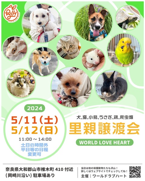 | イベント内容 | ワールドラブハートで里親募集中の動物たちの譲渡会を開催します! 犬猫だけではなく、インコやラット、ウサギにモルモットなどたくさんの保護動物がいます! みんな新しい家族を探しています。写真だけでは伝えきれない魅力が盛りだくさん! 実際に会ってそのかわいさを実感してください♪ ★里親募集中の動物たち★ https://satoya-boshu.net/foster/?@button_name@=search&FosterParent_MemberID=1161 ・犬、猫 ・ハムスター←現在、子ハムスターがたくさんいます! ・ウサギ←12羽います! ・インコ ・キンカチョウ ・ウコッケイ ・ヘビ ・カメ ……など 子犬や子猫もたくさんいますよ♡ ぜひお気軽にお越しください! ●混雑をさけるために、事前予約をお願いします。 予約番号080-8521-9553 ショートメールでも可♪ ●当日までに譲渡が決定した・体調がすぐれないなど、やむを得ない理由で不参加の場合があります。ご希望の子がいましたら、当日お問い合わせください。 ●当日、その場での引き渡しはしておりません。譲渡決定後、自宅訪問を兼ねてこちらからお届け致します。 ご来場お待ちしております♪ ★world love heart(ワールドラブハート)は、奈良県大和郡山市で活動している動物保護団体です。 『引き取り依頼は断らない』をモットーに、犬、猫、鶏、小動物、家畜、爬虫類など捨てられた動物を保護しています。 https://worldloveheart-nara.jimdofree.com |