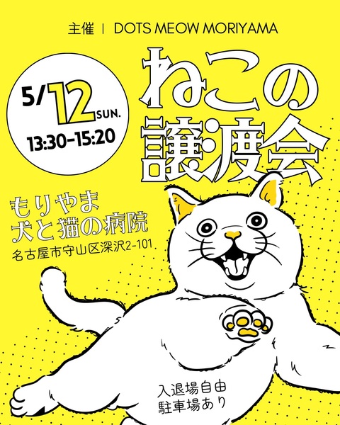 | イベント内容 | ' \ 保護猫譲渡会のお知らせ! / ▶︎ 5 / 12(日)ねこの譲渡会を開催します! ?日時:2024年 5月 12日(日) 13:30〜15:20 ?場所:動物医療センター もりやま犬と猫の病院 (名古屋市守山区深沢2-101 / 2階会議室) ▶ 入退場自由 | 駐車場あり ▶ 参加する保護ねこたちの愉快な暮らしは、 インスタグラムでほぼ毎日公開しています! 【公式アカウントはこちら→ @dotsmeowmoriyama 】 個性爆誕な保護ねこたちに、ぜひ会いに来てくださいね! ・・・ ┏ 参加するねこちゃんをちょこっとご紹介!┓ ?エントリーNO.1 「 マギくん 」? ・甘えたいときは、スリスリゴロンでアピールします。 ・誰かをなでてると、「僕もー」と慌てて飛んできて、 割り込んでまで甘えてきてくれます。 ?エントリーNO.2 「 けいくん 」? ・猫の心に土足で踏み込める天才です。 ・とにかく猫に甘えまくります。 ・そしてなぜかみんなに受け入れられます笑 ?エントリーNO.3 「 すいくん 」✈️ ・ほんのちょっとずつ成長するタイプです。 ・ねこには優しくて、とても寛容です。 ・人とはディスタンスがあります。 ┗ その他の子たちも、当日会場で待ってるよ!┛ ————————————— \ 「保護ねこを応援したい!」皆さまへ ? / ねこちゃんを迎えてあげられなくても、 いろんな方法で応援することができます。 ◤ ①オリジナルグッズの販売をしています ✉️ プロフィールにある「ショップ」から購入できます。 ◤ ②保護ねこに「ギフト」が贈れます ? ︎︎??͜?͉???保護犬・保護猫支援プログラムに参加しています。 プロフィール欄にあるURLをみてね! ◤ ③「フォロー」や「いいね!」で応援できます ? フォロー・いいね・シェア・保存が、 私たちにとって大きな応援になっています。 皆さまの小さくて大きなアクションが、 ずっとのおうちとの出会いにつながっていくかも! ぜひフォローしてね!⇨【 @dotsmeowmoriyama 】 ————————————— 【 お 知 ら せ 】 「のらねこのにゃんでも相談会」のご予約も、 随時受け付けています。 にゃんでも相談会は、事前予約が必要です。 詳細はインスタグラムのプロフィールのトップに固定してある投稿 または ハイライトの「そーだん会!」をご覧ください。 ————————————— ▶ DOTS MEOW MORIYAMAによる野良猫に関する相談支援事業「#のらねこのにゃんでも相談会 」は、名古屋市社会福祉協議会の地域の支え手応援事業「地域の困りごと解決応援助成事業」(名古屋市福祉基金財源)により、助成を受けて実施しています。 #保護猫 #保護猫活動 #保護猫譲渡会 |