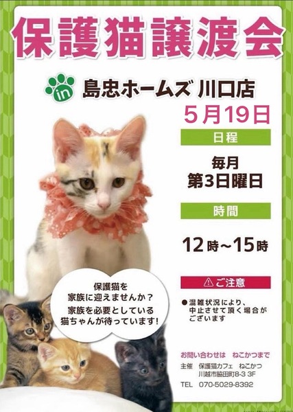 | イベント内容 | *保護猫讓渡会* 日時:5/19(日)12時~15時 場所:ホームズ川口店さま 島忠ホームズ川口店さま譲渡会に参加予定です。 センターからの引き出し、飼育崩壊や所有権放棄などで、生きる場所を失った猫たちが、最大限の医療にかけてピカピカになりました。 写真の猫の他にも甘えっこちゃんたちが、溢れる笑顔でお待ちしています。 ぜひご参加ください。 ***譲渡条件*** *完全室内でお願いします。 *逸走防止対策にご協力頂ける方 *写真付きの身分証をご提示頂ける方 *LINE若しくはメールでのやりとりが可能な方 *譲渡に関する覚え書きにご署名頂ける方 *初期医療費をご負担頂ける方 *その他の譲渡条件を、譲渡会場でお話させて頂ける方 *猫が生まれた年から20年後に、80歳を超えていない方 *お一人暮らしの方は、後見人さまのご同席が必要です。 |