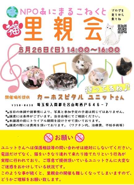 | イベント内容 | 生後2カ月前後の子猫、計11匹参加! 甘えんぼのママ猫や元迷子猫ちゃんなど、成猫も可愛い子揃いですよ! 必ず、直前に更新されるブログをチェックをしてからお越しください♪ グッズ販売もあります♪ ※先着順ではなく里親会後に協議してより良い条件のご家族を選定させて頂いておりますので、お時間早い方が有利という事はありません^^ |