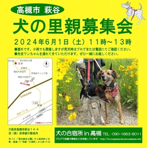 | イベント内容 | ※屋外会場での里親募集会です。簡易な屋根がありますが、荒天時には中止にする可能性がありますので電話または「犬の合宿所in高槻」のブログでご確認ください。 (電話でのお問合せ→090-1863-8011) ※先住ワンちゃんを連れて会いに来て頂けます。相性を見るためにも、是非是非、連れてきてください。 ※「犬の合宿所in高槻」のブログでも参加犬を紹介しています。 →http://inunogassyukusyo.seesaa.net/article/503334984.html 参加犬が直前に変更になる場合がありますので、特に会いたいワンちゃんが決まっている場合は事前に電話で確認頂く方が確実かと思います。【お問合せ➡090-1863-8011】 ・・・・・・・・・・ 市民ボランティア「犬の合宿所in高槻」は、現地での譲渡が難しい離島の保健所収容犬を引き取り関西で新しい飼い主探しをしています。 保護犬を家族として迎えることが文化として定着し、生体販売に伴う悲惨な繁殖犬の存在がなくなることを願っています。 ・・・・・・・・・・・・・・・・・・・・・・・・・・・・・ ★ 一時預かりさんや犬の搬送ボランティアさん、里親募集会の当日お手伝いの方など常時募集しています。 ★犬によっては個別お見合いできる場合があります。 里親募集会に参加できない方で個別お見合いをご希望の方は、預かりさんとの日程調整が必要ですので、電話でお問合せください。⇒090-1863-8011 |