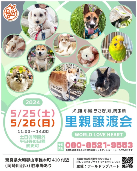 | イベント内容 | ワールドラブハートで里親募集中の動物たちの譲渡会を開催します! 犬猫だけではなく、インコやラット、ウサギにモルモットなどたくさんの保護動物がいます! みんな新しい家族を探しています。写真だけでは伝えきれない魅力が盛りだくさん! 実際に会ってそのかわいさを実感してください♪ ★里親募集中の動物たち★ https://satoya-boshu.net/foster/?@button_name@=search&FosterParent_MemberID=1161 ・犬、猫 ・ハムスター←現在、子ハムスターがたくさんいます! ・ウサギ←12羽います! ・インコ ・キンカチョウ ・ウコッケイ ・ヘビ ・カメ ……など 子犬や子猫もたくさんいますよ♡ ぜひお気軽にお越しください! ●混雑をさけるために、事前予約をお願いします。 予約番号080-8521-9553 ショートメールでも可♪ ●当日までに譲渡が決定した・体調がすぐれないなど、やむを得ない理由で不参加の場合があります。ご希望の子がいましたら、当日お問い合わせください。 ●当日、その場での引き渡しはしておりません。譲渡決定後、自宅訪問を兼ねてこちらからお届け致します。 ご来場お待ちしております♪ ★world love heart(ワールドラブハート)は、奈良県大和郡山市で活動している動物保護団体です。 『引き取り依頼は断らない』をモットーに、犬、猫、鶏、小動物、家畜、爬虫類など捨てられた動物を保護しています。 https://worldloveheart-nara.jimdofree.com |