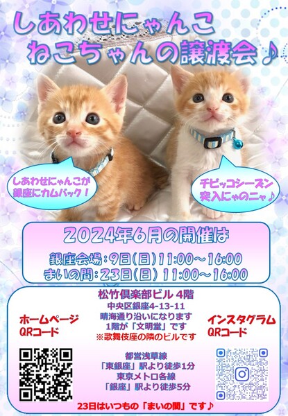 | イベント内容 | 「しあわせにゃんこ」は行き場のない猫ちゃんと里親様との 出逢いの場を提供するグループです♪ 子猫も成猫もハンデのある猫もみんな新しい家族を待っています♪ みなさまのご来場を保護主、スタッフ一同心よりお待ちしております♪ 詳しくはホームページ譲渡会情報をご確認願います。 http://www.shiawasenyanko.net 久々に「しあわせにゃんこ」が銀座にカムバック! 歌舞伎座のすぐ隣という好立地で開催します! チビッコてんこ盛りでお待ちしております♪ ◆開催日/開催時間◆ 2024年6月9日(日) 11:00~16:00 ご希望の猫ちゃんがいらっしゃる場合は11時30分までに受付をお願い致します。 複数のお申し込みがある場合は11時30分で受付を終了させて頂く場合がございます。 受付をされた全ての里親様とお見合いをさせて頂きます。 ※先着順ではございません。 ※当日、猫ちゃんを連れて帰ることは出来ません。 後日調整のうえ保護主が里親様宅へお届けいたします。 ◆会場◆ 中央区銀座4-13-11 松竹倶楽部ビル4階 ※歌舞伎座のすぐ隣のガラス張りのビルです♪ ※1階が文明堂で晴海通り沿いです♪ ※詳しいアクセスはホームページをご覧下さい http://www.shiawasenyanko.net ◆交通手段◆ 都営浅草線「東銀座」駅 A11出口より徒歩1分 東京メトロ各線「銀座」駅より徒歩5分 ※お車でご来場の際、駐車場のご用意はございません。 近隣のコインパーキング等をご利用ください。 ※歌舞伎座ビルパーキングがあります。 いつ里の掲載参加猫一覧はこちらから https://satoya-boshu.net/mypage/foster_list.php?@ps@=none アメーバブログの里親募集にゃんこはこちら https://ameblo.jp/shiawasenyan-ko/theme-10092719565.html ◆猫ちゃんとのお見合い◆ 掲載している猫ちゃんは基本的に譲渡会場でのお見合いのみとなります。 譲渡会への参加が決定している猫ちゃんはその譲渡会で里親様が決定しなかった場合のみ保護主宅でのお見合いが可能となります。 自宅お見合いを希望される里親様はメール(info@shiawasenyanko.net)にてご相談ください。 ◆当譲渡会では猫ちゃんと里親様のスキンシップを大切にしています◆ 新しい家族として20年以上いっしょに暮らしていく猫ちゃんです。 譲渡会場でたくさんの猫ちゃんと触れ合って良きパートナーを見つけてください。 はじめて猫ちゃんを迎える不安や先住猫ちゃんとのトライアルの注意点、猫ちゃんと里親様の暮らし方など気軽にご相談ください。 経験豊富な保護主や猫大好きスタッフがアドバイスさせていただきます。 ◆子猫ご希望の里親様◆ 子猫は急な下痢や発熱等により体調が急変し、数時間対応ができなかっただけでも命を落とす事があります。 その為、当譲渡会では月齢によりお留守番のない又は少ないご家庭への譲渡に限らせて頂いております。 また里親様と子猫ちゃんが安心してトライアル期間を過ごせるよう体重が1㎏程になってからのお届けとさせて頂いております。 ◆里親希望のみなさまへ◆ ご家族の皆様で生涯、家族の一員としてたっぷり愛情を注いでくださるご家庭をお待ちしております。 下記に該当する希望者様へ ・独身、単身者の方 ・友人同士、同棲でのお住まいの方 ・高齢者のみのご家庭の方 は、ご相談の上、譲渡を判断させて頂きます ・適正飼育の不可能な方 ・脱走防止対策を考えて頂けない方 ・定期報告の不可能な方 は、ご遠慮下さいますようお願い致します ◆ご負担頂く費用について◆ 譲渡の際に譲渡負担金(医療費の一部、譲渡金、お届け時の交通費)を里親様にご負担頂く事により 過酷な状況にいる猫ちゃんを保護し新しいご家族の元へ送り出す事ができています。 皆様のご理解とご協力にボランティア一同、心より感謝しております。 ご負担頂く医療費につきましてはホームページに詳しく記載させて頂いております。 http://www.shiawasenyanko.net/onegai.html しあわせにゃんこホームページ http://www.shiawasenyanko.net メールでのお問い合わせ info@shiawasenyanko.net |