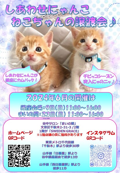 | イベント内容 | 「しあわせにゃんこ」は行き場のない猫ちゃんと里親様との 出逢いの場を提供するグループです♪ 子猫も成猫もハンデのある猫もみんな新しい家族を待っています♪ みなさまのご来場を保護主、スタッフ一同心よりお待ちしております♪ 詳しくはホームページ譲渡会情報をご確認願います。 http://www.shiawasenyanko.net ついにチビッコシーズン突入! 癒されに来てくださいね♪ ◆開催日/開催時間◆ 2024年6月23日(日) 11:00~16:00 ご希望の猫ちゃんがいらっしゃる場合は11時30分までに受付をお願い致します。 複数のお申し込みがある場合は11時30分で受付を終了させて頂く場合がございます。 受付をされた全ての里親様とお見合いをさせて頂きます。 ※先着順ではございません。 ※当日、猫ちゃんを連れて帰ることは出来ません。 後日調整のうえ保護主が里親様宅へお届けいたします。 ◆会場◆ 受付はまいの間1階です♪ ※お店の奥に会場への階段がございます♪ 譲渡会場:東京都文京区千駄木2-31-3 1階が北欧雑貨ショップ「SWEDENGRACE」 2階が谷中サロン「まいの間」 ※詳しいアクセスはホームページをご覧下さい http://www.shiawasenyanko.net 谷中サロン「まいの間」の情報はこちら http://neko-to-kyo.com/#maima ◆交通手段◆ 東京メトロ千代田線「千駄木」駅より徒30秒 JR山手線「西日暮里」駅より徒歩11分 JR山手線「日暮里」駅より谷中銀座経由で徒歩13分 ※お車でご来場の際、駐車場のご用意はございません。 近隣のコインパーキング等をご利用ください。※近隣に沢山あります。 いつ里の掲載参加猫一覧はこちらから https://satoya-boshu.net/mypage/foster_list.php?@ps@=none アメーバブログの里親募集にゃんこはこちら https://ameblo.jp/shiawasenyan-ko/theme-10092719565.html ◆猫ちゃんとのお見合い◆ 掲載している猫ちゃんは基本的に譲渡会場でのお見合いのみとなります。 譲渡会への参加が決定している猫ちゃんはその譲渡会で里親様が決定しなかった場合のみ保護主宅でのお見合いが可能となります。 自宅お見合いを希望される里親様はメール(info@shiawasenyanko.net)にてご相談ください。 ◆当譲渡会では猫ちゃんと里親様のスキンシップを大切にしています◆ 新しい家族として20年以上いっしょに暮らしていく猫ちゃんです。 譲渡会場でたくさんの猫ちゃんと触れ合って良きパートナーを見つけてください。 はじめて猫ちゃんを迎える不安や先住猫ちゃんとのトライアルの注意点、猫ちゃんと里親様の暮らし方など気軽にご相談ください。 経験豊富な保護主や猫大好きスタッフがアドバイスさせていただきます。 ◆子猫ご希望の里親様◆ 子猫は急な下痢や発熱等により体調が急変し、数時間対応ができなかっただけでも命を落とす事があります。 その為、当譲渡会では月齢によりお留守番のない又は少ないご家庭への譲渡に限らせて頂いております。 また里親様と子猫ちゃんが安心してトライアル期間を過ごせるよう体重が1㎏程になってからのお届けとさせて頂いております。 ◆里親希望のみなさまへ◆ ご家族の皆様で生涯、家族の一員としてたっぷり愛情を注いでくださるご家庭をお待ちしております。 下記に該当する希望者様へ ・独身、単身者の方 ・友人同士、同棲でのお住まいの方 ・高齢者のみのご家庭の方 は、ご相談の上、譲渡を判断させて頂きます ・適正飼育の不可能な方 ・脱走防止対策を考えて頂けない方 ・定期報告の不可能な方 は、ご遠慮下さいますようお願い致します ◆ご負担頂く費用について◆ 譲渡の際に譲渡負担金(医療費の一部、譲渡金、お届け時の交通費)を里親様にご負担頂く事により 過酷な状況にいる猫ちゃんを保護し新しいご家族の元へ送り出す事ができています。 皆様のご理解とご協力にボランティア一同、心より感謝しております。 ご負担頂く医療費につきましてはホームページに詳しく記載させて頂いております。 http://www.shiawasenyanko.net/onegai.html しあわせにゃんこホームページ http://www.shiawasenyanko.net メールでのお問い合わせ info@shiawasenyanko.net |