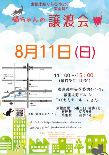 | イベント内容 | 東銀座で保護猫の譲渡会を開催しています「猫の未来とびら」です♪ 恵まれない環境にいる猫たちが未来へのとびらを開いて幸せなご縁に繋がる橋渡しをしていきます。 たくさんの猫ちゃんと保護主・スタッフ一同みなさまのご来場を心よりお待ちしています! 子猫ちゃん〜成猫ちゃんまで参加します♪ ★開催日時 2019年8月11日(日) 11:00~15:00 (最終受付 14:30) ★会場 東京都中央区築地4-1-17 銀座大野ビル B1 TKKセミナールームさんにて (東劇となり) ★最寄駅 東銀座駅 6番出口 徒歩2分 銀座駅 徒歩9分 ・築地駅 徒歩7分 駐車場のご用意はございませんので近隣のコインパーキング等をご利用ください。 会場への直接のお問い合わせはご遠慮くださいませ。 ★☆★★☆★★☆★★☆★★☆★★☆★★☆★★☆★★☆★ 会場で猫ちゃんと触れ合ってご縁を繋いでください。 里親様・猫ちゃんが双方、幸せな家族になれるよう保護主・スタッフがサポート致します。 ご不安な事はお気軽にご相談ください。 入場無料です。事前のご予約は必要ございません。 ★参加予定猫ちゃんはこちら★開催日の1週間前から順次掲載致します。 https://nekonomiraitobira.com/archives/category/next ご希望の猫ちゃんがいらっしゃる里親希望者様は11時~11時30分までに会場へお越しください。 11時30分までに受付されたすべての里親希望者様と保護主がお話をさせて頂き 1匹に複数のお申込み、里親様と猫ちゃんに合うご家庭がございましたら 受付を終了する場合もございます。 里親様が決まっていない猫ちゃんに関しましては随時保護主とご相談ください。 当日猫ちゃんの引き渡しはございません。 後日、保護主が里親様宅へお届けいたします。 ※参加予定猫ちゃんは、急な体調不良等で不参加になる場合もございます。 開催当日の朝、当会ブログにて不参加の最新情報を掲載致しますのでご確認をお願い申し上げます。 ◇譲渡に関してのお願い・基本条件 1.家族の一員として終生最期まで愛育下さい。 2.完全室内飼い・ペット可のお住まい 3.脱走防止対策 4.避妊・去勢手術 5.里親様のご自宅へのお届け 6.譲渡誓約書への署名捺印・身分証明書の提示 7.医療費譲渡金のご負担 8.定期報告 9.トライアル期間有り ※保護主により譲渡条件は異なりますので会場で直接ご相談ください。 60才以上の方のみのご家庭、未成年の方、単身の方、 必要な脱走対策を施していただけない方は譲渡が難しい場合もございますのでご了承ください。 小さな子猫の譲渡は体重が1kgになってからのお届けやお留守番の無い(少ない)ご家庭を希望いたします。 医療費譲渡金に関しましては詳しくはホームページの 【譲渡に関してのお願い】【譲渡の流れ】をご覧くださいませ。 〜主催 猫の未来とびら〜 ホームページ http://nekonomiraitobira.com ブログ最新情報もりだくさん https://ameblo.jp/nekonomiraitobira facebook https://www.facebook.com/nekonomiraitobira.jyotokai twitte https://twitter.com/nekotobira2018 instagram https://www.instagram.com/nekonomiraitobira お問い合わせ先 info@nekonomiraitobira.com |