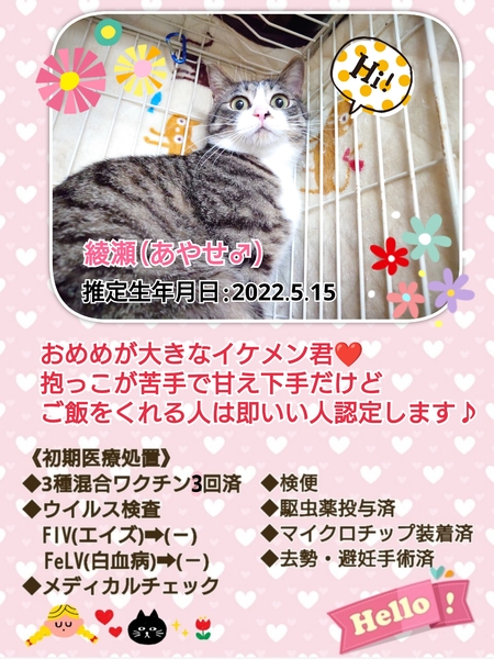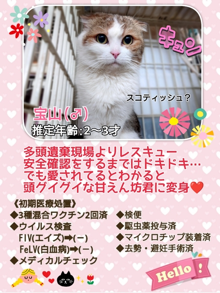 | イベント内容 | 【秘密結社ねこのひげ♡保護猫譲渡会】 5/26(日) 12:00~15:00 さいたま市北区東大成町1-230 金子建材内 ガーデンテラスにて 保護猫譲渡会を開催します☆ 昨年夏~秋生まれの1才までは仔猫だにゃー! な幼猫ちゃんや♪ おつむの中は永遠の仔猫だにゃー! なヤング猫や♪ 小童には負けへんでー! なオトナ猫も♪ 約10頭が参加予定です♪ 未来のご家族さまと 愛し愛されな 両想いになれますように♡ 家族にするなら保護猫だべ♪♪ こんなご時世だけど 新しい家族と笑顔で暮らしたい♪ という方は是非会いにいらしてください♡ ご不明な点がございましたら インスタグラム @秘密結社ねこのひげ の DMまでお問い合わせ下さい☆ |