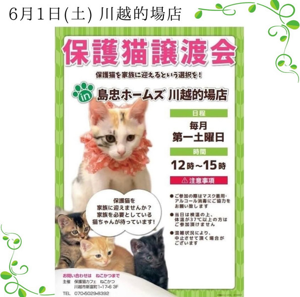 | イベント内容 | *保護猫讓渡会* 日時:*保護猫讓渡会* 日時:6/1(土)12時~15時 場所:ホームズ川越的場店さま センターからの引き出し、飼育崩壊や所有権放棄などで、生きる場所を失った猫たちが、最大限の医療にかけてピカピカになりました。 写真の猫の他にも甘えっこちゃんたちが、溢れる笑顔でお待ちしています。 ぜひご参加ください。 ***譲渡条件*** *完全室内でお願いします。 *逸走防止対策にご協力頂ける方 *写真付きの身分証をご提示頂ける方 *LINE若しくはメールでのやりとりが可能な方 *譲渡に関する覚え書きにご署名頂ける方 *初期医療費をご負担頂ける方 *その他の譲渡条件を、譲渡会場でお話させて頂ける方 *猫が生まれた年から20年後に、80歳を超えていない方 *お一人暮らしの方は、後見人さまのご同席が必要です。 |