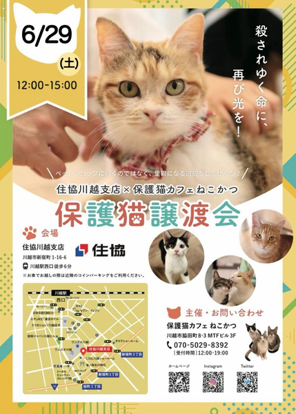 | イベント内容 | 保護猫カフェねこかつさん主催の保護猫譲渡会です☺︎ JR川越駅西口をでたら、徒歩6分 ショッピングモールのお隣が総合不動産建築の 『住協」様です ねこかつさんや個人ボランティアさんの元で大切にお世話された、ちびっ子や大人猫ちゃんがたくさん参加しますʚ₍ᐞ·͈༝·͈ᐞ₎ɞ どなた様もご自由にご参加いただけます*♪ 譲渡会ってどんなところかな? ちょっとみて見たい そんな方々も大歓迎です ❁譲渡には譲渡条件がございます ❁お申込みの際にはアンケートへのご記入がございます ❁当日に猫ちゃんを連れて帰ることはできません ※お車でお越しの際は近隣のコインパーキングをご利用ください |