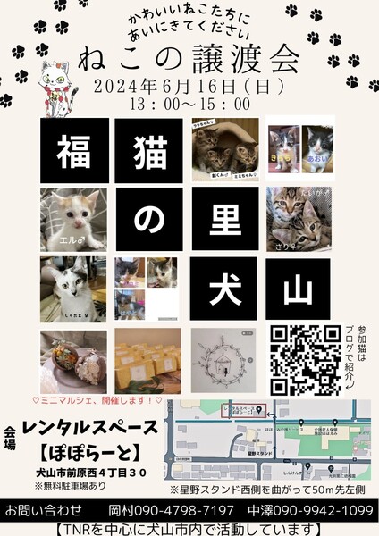 | イベント内容 | 【ココがポイント!】 ★ウイルスチェックなど健康診断済み! 【日時】 6月16日(日)13~15時 【場所】 レンタルスペースぽぽらーと (犬山市前原西4丁目30) 予約不要 広々駐車場あり 福猫の里 犬山「福猫の里便り」 https://hukunekonosato.hatenablog.com/ 【お約束】 当日、会場での猫の引き渡しはしておりません。 後日ご自宅までお届けします。 お試し飼育(トライアル)を1週間〜2週間程して頂き、双方が納得の上で正式譲渡となります。 譲渡の際は、医療費(ワクチン代等)、活動協力費の負担をお願いしております。 ・ペット可のお住まい ・完全室内飼育、終生飼育 ・適切な医療措置 ・不妊手術の実施と報告等、お約束があります。 《 譲渡に関するお願い 》 ◎猫の負担を考え、東海3県で車移動が1時間以内にお住まいの方。(遠方の方はお断りしています。)※通行料がかかりましたらご負担頂く場合もあります。 ◎高齢者のみ世帯への譲渡はお断りしています。託せる方がいれば、一緒に来場下さい。 ◎譲渡は、無償ではありません。猫によって費用が違いますので保護主にお尋ね下さい。 |