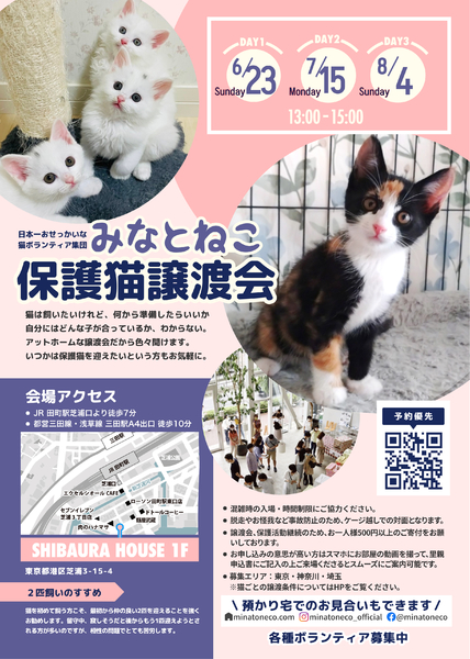 | イベント内容 | みなとねこが毎月定期開催している譲渡会です 2024年も譲渡会を通じて289匹もの猫を161家庭にご縁を繋ぐことができました 譲渡会にはご来場予約が必要です ご予約はみなとねこのHPよりお願いします https://www.minatoneco.com/event 参加猫の詳細はこちら https://www.minatoneco.com/gallery 参加猫たちの様子はYoutubeのみなとねこチャンネルもご覧ください https://youtube.com/playlist?list=PLRxhCqU-Dt77IaUtZCDeratPPI7Jek6ZL ーーー 会場は明るく開放的な雰囲気です Youtube「みなとねこ譲渡会に行ってみよう」 https://youtu.be/8Q4Gti1swQk 25ケージ 50匹ほどの参加となりますが、それ以外の預かり宅の猫もご紹介可能です 子猫は2匹ペアでの譲渡が原則です 初めての方こそ最初から2匹をお勧めしています また私たちボランティアは、ご縁のあった猫たちに終生里親様に愛されて幸せに安全に暮らして欲しいと願っています このため里親になっていただくにはいくつかの条件やお約束事があります。 ◆基本条件(猫それぞれ、保護主により異なります) ・ご家族全員が飼育に賛成であること ・ペット可物件での完全室内飼い、エアコンなどによる室温管理、医師の指示に従い定期的な受診やワクチン接種、 適切な時期(生後4ヶ月中)での避妊去勢、病気予防に配慮したフードの選択、終生飼養をお願いしております。 ・ケージのみの飼育、リビング以外の一室のみでの飼育は不可です。十分な運動のスペースと窓から景色が眺められのんびり日向ぼっこが可能な環境が望ましいと考えています。 ・誤食などの事故防止のため、お部屋の整理整頓や脱走防止にも万全の対策をお願いします。 ・換気が十分でない室内での喫煙をされる方はお断りしております。 ・日々のお世話だけでなく、スキンシップが可能な精神的・時間的・経済的な余裕がある方に限らせていただきます。猫が20年以上生きる中でなるべく変わらぬ環境で愛情を注いで頂けるよう、家族構成やお仕事、お住まいに変化のない方を優先させていただきます。 またお届けやフォローの都合上、募集エリアも東京、神奈川、埼玉に限らせていただいております。 ■里親申込書類一式はみなとねこHPよりダウンロードをお願いします https://www.minatoneco.com/foster-entry 会場では里親申込書を拝見して簡単な面談を行います 会場にてご記入いただくことも可能ですが、面談希望の方が多いとお待ちいただくことになりますので、お手元で印刷していただきご記入の上ご来場いただくことをおすすめしております ※ご家族にアレルギーがある方、喫煙者がいる場合には是非事前にご相談ください ※猫と暮らしたことのない未就学児がいらっしゃる場合には事前にアレルギー検査などお勧めします 実際の参加予定猫 6/22(土)21:00までにみなとねこのHPやFacebookページでご紹介します https://m.facebook.com/minatoneco/ 直接ご応募の方は詳細をLINEなどでやりとりの上で預かり宅でのお見合いも行っております そうした中で譲渡会前に里親様が決定することもございますことご了承ください ※予約優先、30分入替制、混雑時は入場をお待ちいただくなどのご協力をお願いしております ※換気のためにドアをオープンしての開催のためにケージ越しでのご対面となりますことご理解ください ※譲渡会の開催や保護活動の継続のため、お一人様500円以上のご寄付をお願いしております |