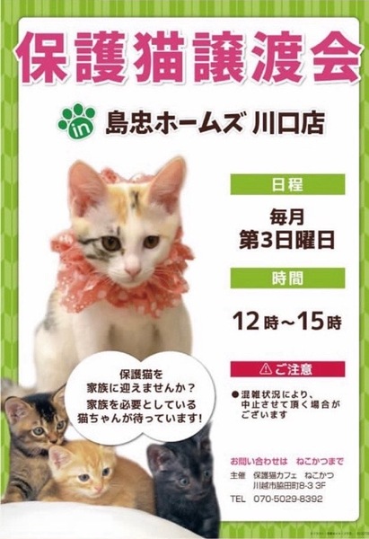 | イベント内容 | *保護猫讓渡会* 日時:6/16(日)12時~15時 場所:ホームズ川口店さま 島忠ホームズ川口店さま譲渡会に参加予定です。 センターからの引き出し、飼育崩壊や所有権放棄などで、生きる場所を失った猫たちが、最大限の医療にかけてピカピカになりました。 写真の猫の他にも甘えっこちゃんたちが、溢れる笑顔でお待ちしています。 ぜひご参加ください。 ***譲渡条件*** *完全室内でお願いします。 *逸走防止対策にご協力頂ける方 *写真付きの身分証をご提示頂ける方 *LINE若しくはメールでのやりとりが可能な方 *譲渡に関する覚え書きにご署名頂ける方 *初期医療費をご負担頂ける方 *その他の譲渡条件を、譲渡会場でお話させて頂ける方 *猫が生まれた年から20年後に、80歳を超えていない方 *お一人暮らしの方は、後見人さまのご同席が必要です。 |