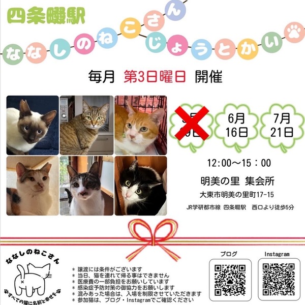 | イベント内容 | 毎月第1日曜日 四条畷駅近辺 明美の里町 集会所にて 毎月第3日曜日 ドン・キホーテ パウ石切店 3階イベント会場にて 猫の譲渡会を開催させていただいています 毎月、可愛い子猫ちゃんや大人猫ちゃんが家族に迎えてくださる方を待っています きちんと感染対策をとった上で譲渡会を開催させていただきますので、皆さん猫ちゃんたちに逢いにいらしてくださいね 会場内には空気清浄機が2台設置してあります 混み合ってきた場合は面会の時間制限をさせていただき、入場まで別のお部屋で待っていただく場合があります 最低限の感染対策をお願いしております 申し訳ありませんが、当日会場での捕獲などのご相談は受け付けておりません 皆さんご協力よろしくお願いします |