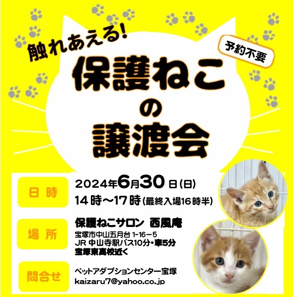 | 開催場所 | 宝塚市中山五月台1-16-5 保護猫サロン 西風庵 | ||