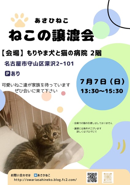 | イベント内容 | 行政機関(保健所・動物愛護センター)から引き取った猫や、地域猫活動中に保護した猫達に家族を探しています (=゚ω゚=) ♡猫を初めて迎えてみたい ♡運命の猫ちゃんと出会いたい ♡先住猫ちゃんの仲間探し 皆様のご来場をお待ちしております! 7月7日(日) 13:30〜15:30 ※毎月第1日曜日 会場 もりやま犬と猫の病院 2F 愛知県名古屋市守山区深沢2-101 駐車場あり ※病院へのお問い合わせはご遠慮下さい お問い合わせはコチラ ma47m@yahoo.co.jp ┈┈┈┈┈┈┈┈┈┈ ◎全頭ワクチン接種、ウイルス(FIV、FeLV)検査、マイクロチップ装着済み ◎譲渡には条件がございます 詳しくは下記ブログをご覧ください ↓↓↓ 主催者【あさひねこ】ブログ http://owariasahineko.blog.fc2.com/ |
