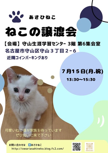 | イベント内容 | 優しい家族を待っている猫たちが 沢山参加します(=゚ω゚=) ♡猫を迎えたい ♡運命の猫ちゃんと出会いたい ♡先住猫ちゃんの仲間探し 皆様のご来場をお待ちしております! 7月15日(月・祝) 13:30〜15:30 会場 守山生涯学習センター3階 第6集会室 名古屋市守山区守山3丁目2−6 近隣コインパーキングあり ※会場へのお問い合わせはご遠慮下さい お問い合わせはコチラ ma47m@yahoo.co.jp ┈┈┈┈┈┈┈┈┈┈ ◎全頭ワクチン接種、ウイルス(FIV、FeLV)検査、マイクロチップ装着済み ◎譲渡には条件がございます 詳しくは下記ブログをご覧ください ↓↓↓ 主催者【あさひねこ】ブログ http://owariasahineko.blog.fc2.com/ |