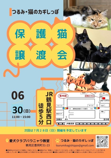 | イベント内容 | 6月30日(日)つるみ・猫のカギしっぽ 定例譲渡会を開催いたします 横浜市鶴見区豊岡町31-23 愛犬クラブバウニャウ 教室内 午前11時~午後3時 お問い合わせ先: tsurumikagishippo@gmail.com 予約は不用です 感染予防のため: ①室内ではマスクを着用していただきます ②入場時にアンケートをご記入いただきます (連絡先等を含む) お問合せは会のメールアドレスにお願いいたします。 tsurumikagishippo@gmail.com 会の譲渡条件をあらかじめ御覧くださいませ (ブログ右上に「ご確認ください」とあります) |