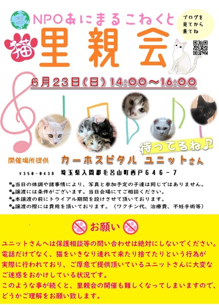 | イベント内容 | 生後2カ月の子猫から成猫まで参加します! 必ず、直前に更新されるブログをチェックをしてからお越しください♪ グッズ販売もあります♪ ※先着順ではなく里親会後に協議してより良い条件のご家族を選定させて頂いておりますので、お時間早い方が有利という事はありません^^ |