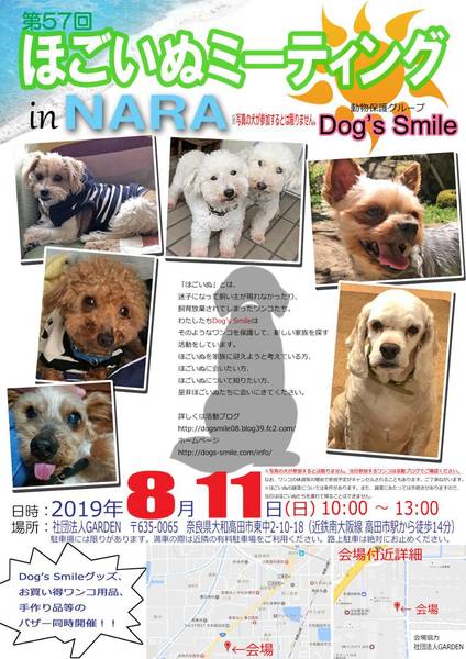 | イベント内容 | 8月11日(日曜日)、奈良県大和高田市内にて「第57回ほごいぬミーティング」を開催します。 保護犬を家族に迎えようと考えている方、保護犬に会ってみたい方、保護犬について知りたい方、ぜひご来場ください。 相性を見るためなど先住わんこさん、卒業わんこさんのご参加ももちろんOKです。 当日は、Dog's smileグッズやワンコ用品の販売、Dog's smileを応援してくださる方々が手作りされた手作り雑貨などの販売も行います。どれもお買い得です。 また、売り上げは、私たちの活動資金になります。ぜひご協力をお願いします。 なお、来場予定のワンコについては、活動ブログでご確認ください。 日時 令和元年8月11日(日)午前10時~午後1時 場所 一般財団法人ワンネスグループ奈良GARDEN 奈良県大和高田市東中2丁目10-18 (近鉄南大阪線高田市駅から南西に徒歩14分) 協力 一般財団法人ワンネスグループ 9月のほごいぬミーティングは、9月8日(日)、今回と同じく奈良GARDENさんをお借りして開催する予定です。 |