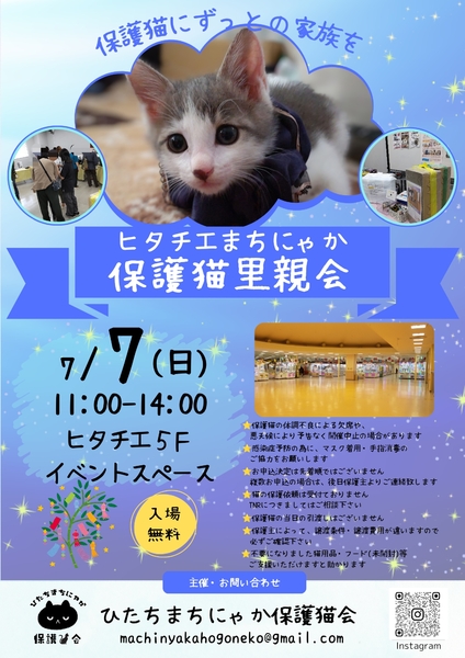 | イベント内容 | 8月で1周年を迎えるひたちまちにゃか保護猫里親会 同じく5月に1周年を迎えた日立市の商業施設『ヒタチエ』での里親会初開催が決定しました! 春に産まれた子猫から落ち着いた大人猫まで、個人ボランティアが大切にお世話している猫ちゃん達が、ずっとの家族との出会いを待っています! 是非会いに遊びに来て下さい? 予約不要・入場無料? (混雑時は整理券を配布させて頂きます) ※当日の保護猫の体調不良による欠席や、突然の天候不良の為の中止の場合がございます ※お申込は先着順ではございません 重複お申込の場合は後日保護主よりご連絡させて頂きます ※当日の保護猫の引渡しはございません ※感染症防止の為、マスク着用・手指消毒にご協力下さい ※猫の保護依頼は受け付けておりません TNRにつきましてはご相談下さい ※保護主によって譲渡条件・譲渡費用が違いますので必ずご確認下さい 〜里親を探したい保護主さんも随時募集しております〜 一緒に里親探ししませんか? 参加条件有・参加費無料 お問い合わせ先 ひたちまちにゃか保護猫会 ?machinyakahogoneko@gmail.com https://www.instagram.com/masa3sun?igsh=b2E4M3JhdGxrazRn |
