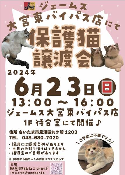 | イベント内容 | 6/23(日)13:00~16:00は♪ ジェームス大宮東バイパス店 〒337-0001 さいたま市見沼区丸ヶ崎1203 にて♪ 秘密結社ねこのひげ 保護猫譲渡会を開催します☆ カー用品を見に来たらば… 保護猫譲渡会をやっててビックリ! (⊙⊙)ファッ!? 車のメンテナンスに来たらば… 保護猫がいぱーーい♪で (*´Д`*)ハァハァ♡ 新しい家族を探しに来たらば… 出逢っちゃった♡ (o・ω[+]ロックオン!! などなど♪ お迎え目的の方はもちろんのこと そうでない方も!! 是非お気軽にお立ち寄りくださいませ☆ (ΦωΦ)ココロヨリオマチシテマース♡ ご不明な点がございましたら インスタグラム @秘密結社ねこのひげ の DMまでお問い合わせ下さい☆ |