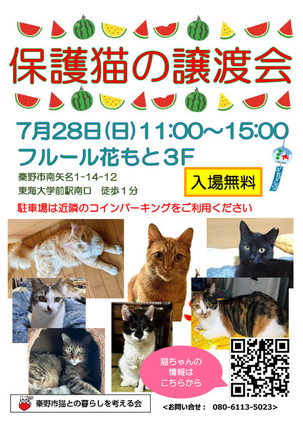 | イベント内容 | 猫の譲渡会を開催いたします。 譲渡会に参加する猫ちゃんは、随時ホームページに掲載していきます。 https://hadanoneko.org/category/recruitment/ 日時:2024年 7月28日(日) 11:00~15:00 会場:フルール花もと 3F 住所:神奈川秦野市南矢名1丁目14-12 アクセス: 電車:小田急小田原線「東海大学前駅」より徒歩2分 車 :国道246号線 桜坂交差点より12分 東名秦野ICより17分 駐車場は近隣のコインパーキングをご利用下さい ● 事前の申し込み等は不要です。 |