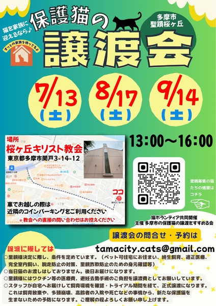 | イベント内容 | 多摩市を中心に猫ボランティア協働で保護猫の譲渡会を開催しています。 事情があって保護された猫さんたちが参加予定です。 チラシに付いてるQRコードまたはこちらのリンクから 猫たちの様子が見れます。 https://profu.link/u/tamacitycats 完全予約制ではありませんが、予約された方から優先的にご案内致します。 参加お申込み・お問合せはコチラ tamacity.cats@gmail.com 【日時】8月17日(土) 13:00〜16:00 【場所】桜ヶ丘キリスト教会 多摩市関戸3-14-12 (聖蹟桜ヶ丘駅徒歩8分) ※車でお越しの際は近隣のコインパーキングをご利用下さい。 【譲渡までの流れ】 ①譲渡会にて猫を決めたら預かりボランティアに話を聞く ②エントリーシートに記入 ③お届け(里親様宅へお伺いします) ④トライアル期間 ⑤誓約書を交わして本譲渡 【譲渡地域】 多摩市・府中市・日野市・八王子市・立川市・国立市・稲城市・相模原市・町田市他 【譲渡条件】 ①ペット可住宅にお住まいで、同居の方全員の了解がある。 ②経済的・体力的・時間的に猫を養える見込みがある ③完全室内飼い ④終生飼育 ⑤子猫の場合は留守にする時間が短いご家庭 ※単身者・高齢者の方には後見人必須 |