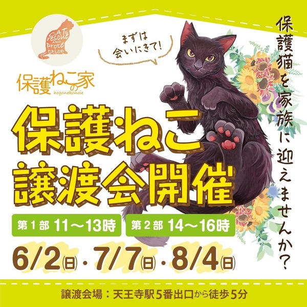 | イベント内容 | 毎月第1日曜の11時~13時と14時~16時の2部制にて「保護ねこの家 譲渡会」を開催しています。 会場は、天王寺駅から徒歩5分。 会場横には、コインパーキングもあります。 また、同日同時刻に「保護ねこの家 オンライン譲渡会」も開催しています。 子猫から大人猫までたくさんの保護猫たちが参加します。 是非、会場まで足をお運びください。 ------------ 【 日時 】 毎月第1日曜 第1部:11時~13時 第2部:14時~16時 ※1部と2部では参加猫が異なります 【 会場 】 Bear's Kitchen 大阪市阿倍野区旭町1丁目1-22 山本ビル1F 【 アクセス 】 大阪メトロ 天王寺駅 5番出口 西へ徒歩5分 会場横にコインパーキングあり ▾アクセス動画▾ https://youtu.be/fx1OtVDPgl4 【 参加条件 】 参加費は無料となります 予約や事前エントリーなどは不要です 未成年者のみ・高齢者のみのご来場はご遠慮ください 【 参加猫 】 当会SNSにて開催7日前より順次案内いたします ▾Instagram▾ https://www.instagram.com/hogonekonoie_st/ ▾X(Twitter)▾ https://twitter.com/hogonekonoie_st ▾ブログ▾ https://ameblo.jp/hogonekonoie/theme-10113553723.html/ 【 詳細情報やお問合せ 】 当会Webサイトをご確認ください ▾保護ねこの家 Webサイト▾ https://www.hogonekonoie.jp/jotokai/ ------------ |