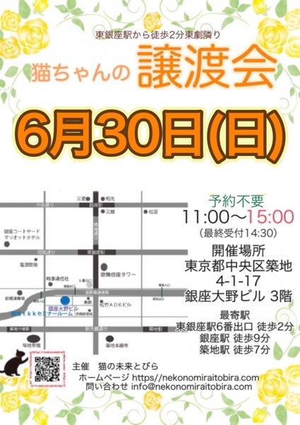 | イベント内容 | 東銀座で保護猫の譲渡会を開催しています「猫の未来とびら」です♪ 恵まれない環境にいる猫たちが未来へのとびらを開いて幸せなご縁に繋がる橋渡しをしていきます。 たくさんの猫ちゃんと保護主・スタッフ一同みなさまのご来場を心よりお待ちしています! 子猫ちゃん〜成猫ちゃんまで参加します♪ 【ご来場いただく皆様には下記についてお願い致します】 ★不織布マスクを着用するしないは自己判断でお願い致します。 ★譲渡会場にお入り頂く前に手洗いと手の消毒をお願い致します。 ★熱のある方や体調の優れない方は譲渡会への来場を見合わせて頂けますよう、お願い致します。 ★来場者数によりましては人数制限もありますので長時間お待たせてする場合もございます。 予めご了承下さい。 ★☆★★☆★★☆★★☆★★☆★★☆★★☆★★☆★★☆★ ★開催日時 2024年6月30日(日) 11:00~15:00(最終受付 14:30) ★会場 東京都中央区築地4-1-17 銀座大野ビル 3階 (東劇となり) ★最寄駅 東銀座駅 6番出口 徒歩2分 銀座駅 徒歩9分 ・築地駅 徒歩7分 駐車場は当ビル又は近隣のコインパーキング等をご利用ください。 会場への直接のお問い合わせはご遠慮くださいませ。 ★☆★★☆★★☆★★☆★★☆★★☆★★☆★★☆★★☆★ 会場で猫ちゃんと触れ合ってご縁を繋いでください。 里親様・猫ちゃんが双方、幸せな家族になれるよう保護主・スタッフがサポート致します。 ご不安な事はお気軽にご相談ください。 入場無料です。事前のご予約は不要です。 当日猫ちゃんの引き渡しはございません。 後日、保護主が里親様宅へお届けいたします。 ※参加予定猫ちゃんは、急な体調不良等で不参加になる場合もございます。 開催当日の朝、当会ブログにて不参加の最新情報を掲載致しますのでご確認をお願い申し上げます。 ◇譲渡に関してのお願い・基本条件 1.家族の一員として終生最期まで愛育下さい。 2.完全室内飼い・ペット可のお住まい(契約書を拝見致します) 3.脱走防止対策 4.避妊・去勢手術 5.里親様のご自宅へのお届け 6.譲渡誓約書への署名捺印・身分証明書の提示 7.医療費譲渡金のご負担 8.定期報告 9.トライアル期間有り ※保護主により譲渡条件は異なりますので会場で直接ご相談ください。 60才以上の方のみのご家庭、未成年の方、単身の方、同棲中の方、 小学生低学年以下のお子様のいる方、必要な脱走対策を施していただけない方は譲渡をご遠慮頂く場合もございますのでご了承ください。 仔猫の場合は主にお世話される方のご年齢は55歳までとさせて頂きます。 オーバーする方はご相談くださいませ。 小さな子猫の譲渡は体重が1kgになってからのお届けやお留守番の無い(少ない)ご家庭を希望いたします。 医療費譲渡金に関しましては詳しくはホームページの 【譲渡に関してのお願い】【譲渡の流れ】をご覧くださいませ。 ~主催 猫の未来とびら~ |