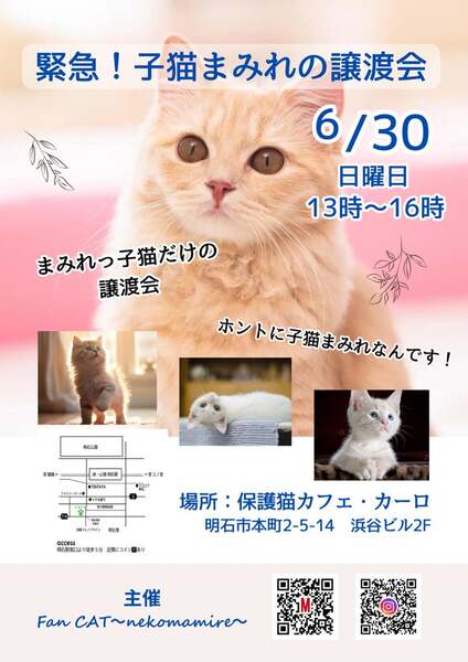 | イベント内容 | 子猫ばかりの譲渡会 in 明石市 日時 6月30日(日)13時から16時まで(譲渡会参加は無料です) 場所:明石市本町2-5-14 浜谷ビル2階 保護猫カフェ・カーロ 事務所側 (譲渡会のお問合せはカーロさんにしないようにお願いします) Pは近くにコインパーキングがたくさんありますのでご利用お願いします 可愛い子猫ちゃんばかりが参加しています♪ 譲渡会の1週間前くらいから参加猫さんの紹介をしていますのでブログにてご確認ください 本気で猫を飼いたい方是非ご来場ください 早い順ではございませんが早くに決まってしまう場合がございますので お早めにお越しいただくか面会予約をお願いします ※猫の譲渡は無料ではありません(譲渡会参加は無料です) ※当日連れて帰れません ※譲渡条件があります 子猫なので里親希望者様の年齢制限がございます ●参加猫たちのお紹介やお問い合わせ(面会予約等)は ブログまたはInstagramDMよりご連絡お願いします https://mycatkobe.blog.fc2.com/ 主催:Fan CAT~nekomamire~ |