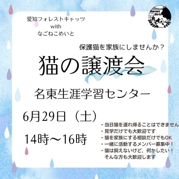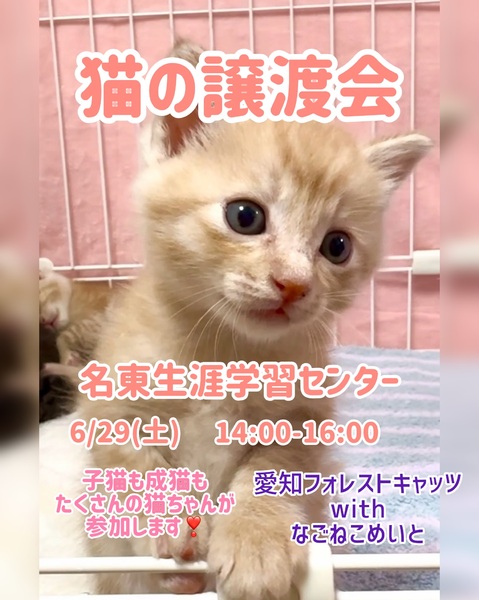| イベント内容 | 日時 6月29日(土) 14時〜16時 場所 名東生涯学習センター 主催 愛知フォレストキャッツwithなごねこめいと 地域猫活動やTNR活動の過程などで 保護した猫たち 子猫もいれば、大人猫もいます 見学、相談だけでも大丈夫! 予約不要、参加費無料なのでお気軽に 猫に関する活動を何かしたい、という方も歓迎です 遊びに来る感覚で、お越しくださいませ ☆猫に関して☆ 各団体の保護主さんごとに決めているお約束事があります ・当日は猫を連れ帰ることはできません ・猫を迎えるにあたり、飼育環境などについて お話しをさせていただきトライアル(お試し飼育) から始めさせていただきます ・2週間前後のトライアル期間を経て、問題ない ようであれば、譲渡契約書を結び正式譲渡と なります ・所定の譲渡費用をいただきます |