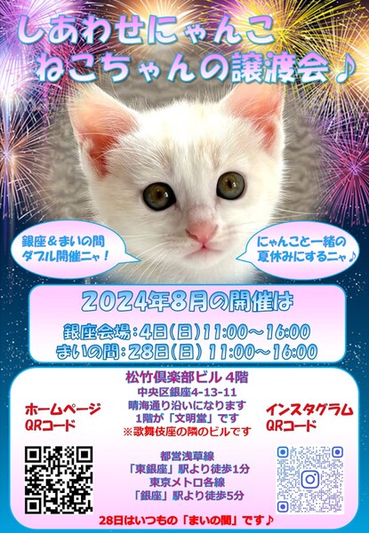 | イベント内容 | 「しあわせにゃんこ」は行き場のない猫ちゃんと里親様との 出逢いの場を提供するグループです♪ 子猫も成猫もハンデのある猫もみんな新しい家族を待っています♪ みなさまのご来場を保護主、スタッフ一同心よりお待ちしております♪ 詳しくはホームページ譲渡会情報をご確認願います。 http://www.shiawasenyanko.net 歌舞伎座のすぐ隣という好立地で開催します! チビッコてんこ盛りでお待ちしております♪ ◆開催日/開催時間◆ 2024年8月4日(日) 11:00~16:00 ご希望の猫ちゃんがいらっしゃる場合は11時30分までに受付をお願い致します。 複数のお申し込みがある場合は11時30分で受付を終了させて頂く場合がございます。 受付をされた全ての里親様とお見合いをさせて頂きます。 ※先着順ではございません。 ※当日、猫ちゃんを連れて帰ることは出来ません。 後日調整のうえ保護主が里親様宅へお届けいたします。 ◆会場◆ 中央区銀座4-13-11 松竹倶楽部ビル4階 ※歌舞伎座のすぐ隣のガラス張りのビルです♪ ※1階が文明堂で晴海通り沿いです♪ ※詳しいアクセスはホームページをご覧下さい http://www.shiawasenyanko.net ◆交通手段◆ 都営浅草線「東銀座」駅 A11出口より徒歩1分 東京メトロ各線「銀座」駅より徒歩5分 ※お車でご来場の際、駐車場のご用意はございません。 近隣のコインパーキング等をご利用ください。 ※歌舞伎座ビルパーキングがあります。 いつ里の掲載参加猫一覧はこちらから https://satoya-boshu.net/mypage/foster_list.php?@ps@=none アメーバブログの里親募集にゃんこはこちら https://ameblo.jp/shiawasenyan-ko/theme-10092719565.html ◆猫ちゃんとのお見合い◆ 掲載している猫ちゃんは基本的に譲渡会場でのお見合いのみとなります。 譲渡会への参加が決定している猫ちゃんはその譲渡会で里親様が決定しなかった場合のみ保護主宅でのお見合いが可能となります。 自宅お見合いを希望される里親様はメール(info@shiawasenyanko.net)にてご相談ください。 ◆当譲渡会では猫ちゃんと里親様のスキンシップを大切にしています◆ 新しい家族として20年以上いっしょに暮らしていく猫ちゃんです。 譲渡会場でたくさんの猫ちゃんと触れ合って良きパートナーを見つけてください。 はじめて猫ちゃんを迎える不安や先住猫ちゃんとのトライアルの注意点、猫ちゃんと里親様の暮らし方など気軽にご相談ください。 経験豊富な保護主や猫大好きスタッフがアドバイスさせていただきます。 ◆子猫ご希望の里親様◆ 子猫は急な下痢や発熱等により体調が急変し、数時間対応ができなかっただけでも命を落とす事があります。 その為、当譲渡会では月齢によりお留守番のない又は少ないご家庭への譲渡に限らせて頂いております。 また里親様と子猫ちゃんが安心してトライアル期間を過ごせるよう体重が1㎏程になってからのお届けとさせて頂いております。 ◆里親希望のみなさまへ◆ ご家族の皆様で生涯、家族の一員としてたっぷり愛情を注いでくださるご家庭をお待ちしております。 下記に該当する希望者様へ ・独身、単身者の方 ・友人同士、同棲でのお住まいの方 ・高齢者のみのご家庭の方 は、ご相談の上、譲渡を判断させて頂きます ・適正飼育の不可能な方 ・脱走防止対策を考えて頂けない方 ・定期報告の不可能な方 は、ご遠慮下さいますようお願い致します ◆ご負担頂く費用について◆ 譲渡の際に譲渡負担金(医療費の一部、譲渡金、お届け時の交通費)を里親様にご負担頂く事により 過酷な状況にいる猫ちゃんを保護し新しいご家族の元へ送り出す事ができています。 皆様のご理解とご協力にボランティア一同、心より感謝しております。 ご負担頂く医療費につきましてはホームページに詳しく記載させて頂いております。 http://www.shiawasenyanko.net/onegai.html しあわせにゃんこホームページ http://www.shiawasenyanko.net メールでのお問い合わせ info@shiawasenyanko.net |