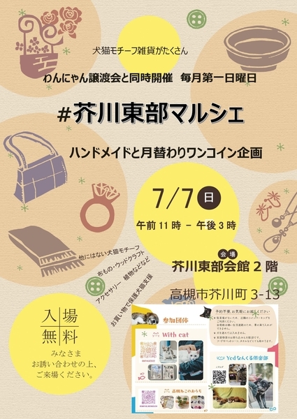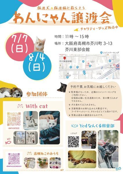 | イベント内容 | 毎月第一日曜日に高槻市の芥川東部会館で開催している「わんにゃん譲渡会」 里親さんを待っている猫ちゃんがたくさんと犬が少々参加します ★★二階ではチャリティハンドメイド販売と月替わりイベントを開催してます。7/7はタロット占いとオーナー様用焼き菓子の販売、ワンコインネイルをします。 |