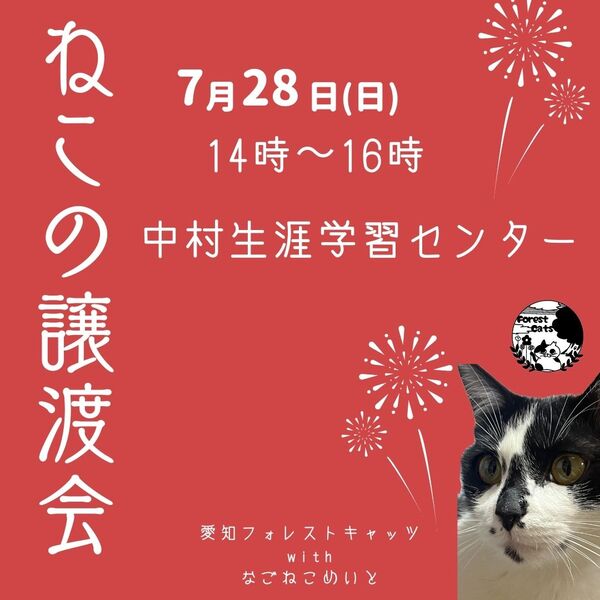 | イベント内容 | 日時 7月28日(日) 14時〜16時 場所 中村生涯学習センター 主催 愛知フォレストキャッツwithなごねこめいと 地域猫活動やTNR活動の過程などで 保護した猫たち 子猫もいれば、大人猫もいます 見学、相談だけでも大丈夫! 予約不要、参加費無料なのでお気軽に 猫に関する活動を何かしたい、という方も歓迎です 遊びに来る感覚で、お越しくださいませ ☆猫に関して☆ 各団体の保護主さんごとに決めているお約束事があります ・当日は猫を連れ帰ることはできません ・猫を迎えるにあたり、飼育環境などについて お話しをさせていただきトライアル(お試し飼育) から始めさせていただきます ・2週間前後のトライアル期間を経て、問題ない ようであれば、譲渡契約書を結び正式譲渡と なります ・所定の譲渡費用をいただきます |
