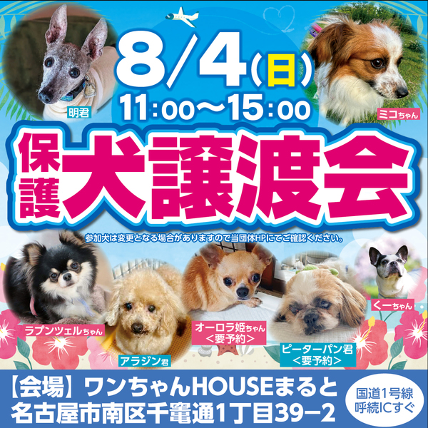 | 開催場所 | 名古屋市南区千竃通1丁目39−2 ワンちゃん HOUSE まると | ||