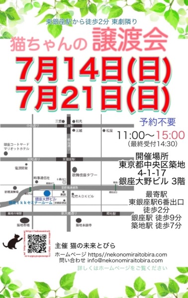 | イベント内容 | 東銀座で保護猫の譲渡会を開催しています「猫の未来とびら」です♪ 恵まれない環境にいる猫たちが未来へのとびらを開いて幸せなご縁に繋がる橋渡しをしていきます。 たくさんの猫ちゃんと保護主・スタッフ一同みなさまのご来場を心よりお待ちしています! 子猫ちゃん〜成猫ちゃんまで参加します♪ 【ご来場いただく皆様には下記についてお願い致します】 ★不織布マスクを着用するしないは自己判断でお願い致します。 ★譲渡会場にお入り頂く前に手洗いと手の消毒をお願い致します。 ★熱のある方や体調の優れない方は譲渡会への来場を見合わせて頂けますよう、お願い致します。 ★来場者数によりましては人数制限もありますので長時間お待たせてする場合もございます。 予めご了承下さい。 ★☆★★☆★★☆★★☆★★☆★★☆★★☆★★☆★★☆★ ★開催日時 2024年7月14日(日) 11:00~15:00(最終受付 14:30) ★会場 東京都中央区築地4-1-17 銀座大野ビル 3階 (東劇となり) ★最寄駅 東銀座駅 6番出口 徒歩2分 銀座駅 徒歩9分 ・築地駅 徒歩7分 駐車場は当ビル又は近隣のコインパーキング等をご利用ください。 会場への直接のお問い合わせはご遠慮くださいませ。 ★☆★★☆★★☆★★☆★★☆★★☆★★☆★★☆★★☆★ 会場で猫ちゃんと触れ合ってご縁を繋いでください。 里親様・猫ちゃんが双方、幸せな家族になれるよう保護主・スタッフがサポート致します。 ご不安な事はお気軽にご相談ください。 入場無料です。事前のご予約は不要です。 当日猫ちゃんの引き渡しはございません。 後日、保護主が里親様宅へお届けいたします。 ※参加予定猫ちゃんは、急な体調不良等で不参加になる場合もございます。 開催当日の朝、当会ブログにて不参加の最新情報を掲載致しますのでご確認をお願い申し上げます。 ◇譲渡に関してのお願い・基本条件 1.家族の一員として終生最期まで愛育下さい。 2.完全室内飼い・ペット可のお住まい(契約書を拝見致します) 3.脱走防止対策 4.避妊・去勢手術 5.里親様のご自宅へのお届け 6.譲渡誓約書への署名捺印・身分証明書の提示 7.医療費譲渡金のご負担 8.定期報告 9.トライアル期間有り ※保護主により譲渡条件は異なりますので会場で直接ご相談ください。 60才以上の方のみのご家庭、未成年の方、単身の方、同棲中の方、 小学生低学年以下のお子様のいる方、必要な脱走対策を施していただけない方は譲渡をご遠慮頂く場合もございますのでご了承ください。 仔猫の場合は主にお世話される方のご年齢は55歳までとさせて頂きます。 オーバーする方はご相談くださいませ。 小さな子猫の譲渡は体重が1kgになってからのお届けやお留守番の無い(少ない)ご家庭を希望いたします。 医療費譲渡金に関しましては詳しくはホームページの 【譲渡に関してのお願い】【譲渡の流れ】をご覧くださいませ。 ~主催 猫の未来とびら~ |