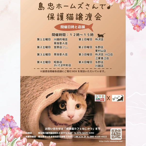 | イベント内容 | 保護猫カフェねこかつさん主催の保護猫譲渡会です☺︎ ねこかつさんや個人ボランティアさんの元で大切にお世話された、ちびっ子や大人猫ちゃんがたくさん参加しますʚ₍ᐞ·͈༝·͈ᐞ₎ɞ 島忠ホームズ東村山店様での譲渡会では、保護猫シェルターボニズハウスさんのハンドメイドの可愛い猫ちゃんグッズのチャリティー販売もございます❤︎ どなた様もご自由にご参加いただけます*♪ ❁譲渡には譲渡条件がございます ❁お申込みの際にはアンケートへのご記入がございます ❁当日に猫ちゃんを連れて帰ることはできません |