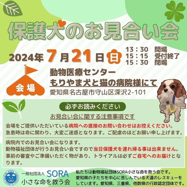 | イベント内容 | 保護犬のお見合い会を開催致します。 【注意】会場をご提供頂いている病院への直接のお問い合わせはお控えください。急患時は命に関わり、大変ご迷惑となります。ご配慮のほどお願い申し上げます。 もりやま犬と猫の病院さま2階会議室 〒463-0811名古屋市守山区深沢2-101 <ご注意>事前のお申込みは不要です。保護活動ブログで、開催日の数日前に譲渡会参加が決定したワンコたちのご案内もしておりますので、ご希望のワンコの参加をご確認してお越し頂けますと幸いです。 SORA公式ホームページhttps://sora-chiisana.org/foster/ SORA公式活動メインブログhttps://ameblo.jp/sora-chisana-inochi/ SORAイベントブログhttps://ameblo.jp/sora-charity-events/ |
