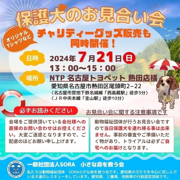 | イベント内容 | 保護犬のお見合い会を開催致します。 ぜひ可愛い保護っ子達に会いに来て下さいね。 チャリティーグッズの収益は、全て保護犬の医療など保護活動使わせていただきます。 事前のお申込みは不要です。保護活動ブログで、開催日の数日前に譲渡会参加が決定したワンコたちのご案内もしておりますので、ご希望のワンコの参加をご確認してお越し頂けますと幸いです。 SORA公式ホームページ https://sora-chiisana.org/foster/ SORA公式活動メインブログ https://ameblo.jp/sora-chiisana-inochi/ SORAイベントブログ https://ameblo.jp/sora-charity-events/ |