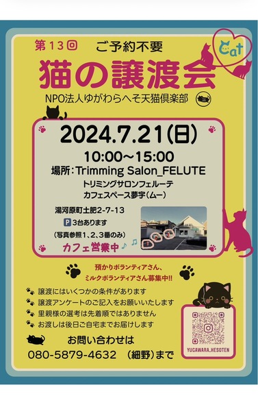 | イベント内容 | 神奈川県湯河原町、駅から海に向かって歩いた郵便局の裏手で譲渡会を開催します。 湯河原町真鶴町で生まれ保護された猫ちゃん達が参加します。預かりスタッフから普段の様子や気になることをじっくり問い合わせながらゆっくり見ていただけます。是非新しい家族になってください。子猫も沢山参加予定です。 私達と一緒に活動してくれるボランティアさん募集中です。 預かりボランティア、ミルクボランティア、元気なシニアボランティアさん、DIYが得意な方、力仕事のお手伝いをして下さる方。是非様子を見に来て下さいね。 |