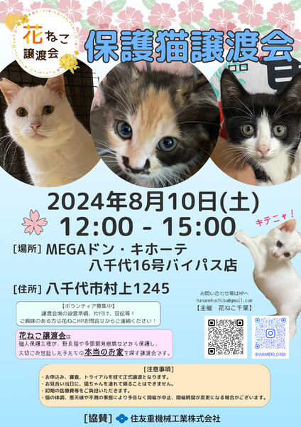 | イベント内容 | 花ねこ譲渡会は、個人保護主さんが保護して大切にお世話した猫の「本当のお家」を探す譲渡会です。 是非一度遊びに来て下さい。ご予約は不要です。 https://hananeko.daa.jp/ |