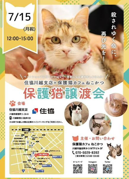 | イベント内容 | 保護猫カフェねこかつさん主催の保護猫譲渡会です︎︎︎︎ JR川越駅西口をでたら、徒歩6分 ショッピングモールのお隣が総合不動産建築の『住協」様です ねこかつさんの元で大切にお世話された、ちびっ子や大人猫ちゃんがたくさん参加します。 どなた様もご自由にご参加いただけます 譲渡会ってどんなところかな? ちょっとみて見たい そんな方々も大歓迎です ❁譲渡には譲渡条件がございます ❁お申込みの際にはアンケートへのご記入がございます ❁譲渡会当日に猫ちゃんを連れて帰ることはできません ※お車でお越しの際は近隣のコインパーキングをご利用ください |