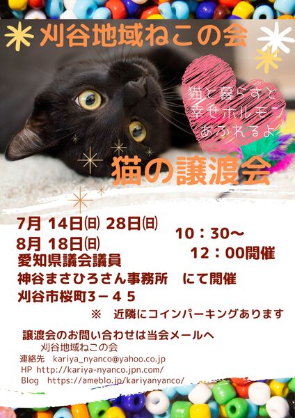 | イベント内容 | ご来場いただいた方の数により、入場や時間を制限させて頂く場合がございます。 単身者・未婚のカップル、 60歳以上の方のみのご家庭は譲渡対象外とします。 (後見人がいる場合は例外ですが、同意書を頂きます) 希望者様条件(家族の同意、ペット可住宅、終生飼育、不妊去勢手術、ワクチンなど適正医療、 脱走防止具体策など)を確認させて頂きます。 その際は家族希望アンケートにご記入いただきます。 譲渡までのながれ < 面会 > 譲渡会へお越しいただく。 猫が決まったら家族希望アンケートを記入していただきます。 < お届け > 基本的に面会時のお渡しではなく、後日のお届けとなります。 当会から、担当の者が猫をご自宅までお届けし、飼育環境の確認をさせていただきます。 (脱走が強く懸念される場合は、譲渡をお断りする可能性があります。) ★ 遠方の方の場合は、往復の高速代をお願いしております。 < トライアル(お試し生活)> トライアル契約書を記入。 原則として期間は2週間程度(延長・短縮あり) この時点で譲渡金をお預かりさせて頂きます。 金額: 不妊手術していない猫 15,000円 不妊手術終了猫 20,000円 (2020.04月 改定しました) < 正式譲渡 > ★避妊・虚勢していない状態で譲渡する猫に関しましては、 手術終了後まで見守らせていただきます。 刈谷地域ねこの会 ホームページ http://kariya-nyanco.jpn.com/ |