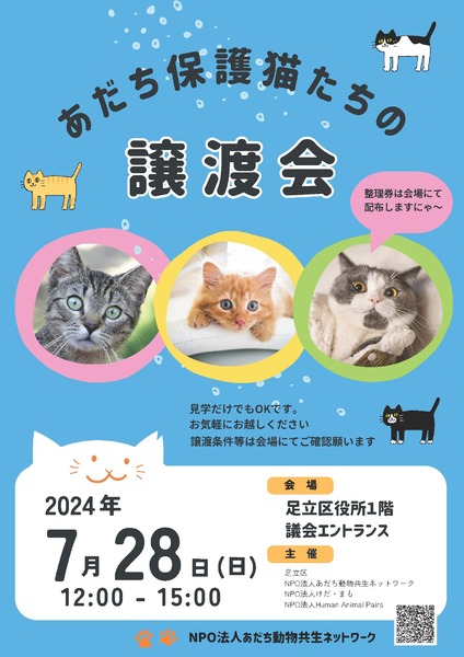 | イベント内容 | イベント概要 ◆イベント名:第5回 あだち保護猫たちの譲渡会 ◆日時:2024年7月28日(日) 12:00-15:00 ◆場所:足立区役所 議会棟エントランス(屋内)(足立区中央本町1-17-1) ◆主催:足立区、NPO法人あだち動物共生ネットワーク、NPO法人けだ・まも、NPO法人Human Animal Pairs 足立区公式ホームページ https://www.city.adachi.tokyo.jp/sekatsuese/kurashi/dobutsu/doubutuaigo.html 当法人ホームページ https://www.adachianimalnet.org/ お問い合わせ info.adachi.aninet@gmail.com 昨年11/26に引き続き、足立区役所 議会棟エントランス内にて、「第5回 あだち保護猫たちの譲渡会」を開催いたします。 動物愛護相談窓口で活動しているNPO法人三団体と足立区とで協働開催となります。 足立区内で保護された猫が多数参加しますので、保護猫をお迎えしたいとお考えの方は是非ご来場いただけると嬉しいです。 勿論、足立区外の方にも譲渡しておりますし、ご見学だけ・ご相談だけのご来場も歓迎です。 ご来場いただいた方には、当法人と帝京科学大学有志で作成したペット防災に使える手帳と漫画の無料配布を行います。 当法人のスタッフは、青いTシャツでお待ちしていますので、お気軽にスタッフにお声がけください! ※区外の方も大歓迎です。是非お越しください。 お車でお越しの方は地下駐車場がございます(有料) 足立区役所行きバスも複数ございます https://busmap.info/busstop/80059/ ※譲渡金について:参加する猫は、一般家庭(保護主さん宅)にて普通の家庭の猫同様のケアを受けながら暮らしている猫たちです。 ノミダニ駆除、ワクチン接種、検便、ウィルスチェック、不妊去勢手術など、適宜最低限の処置を行いながら保護主さんたちが自前で保護預かりを行っています。新しい飼い主さんに、そうした費用の一部をご負担いただくことで保護や譲渡活動は成立しますので、ご理解ご協力を宜しくお願いいたします。 (譲渡費用は当日はいただきません) 注意事項 ・譲渡は先着順ではありません。その猫の年齢・性格などを考慮して、適した飼育が可能な方に譲渡いたします。 ・当日、猫を連れ帰ることはできません。お話がまとまったら、後日こちらからご自宅までお届けいたします。→トライアルスタート→一定期間を経て問題なければ正式譲渡になります (譲渡会当日はキャリーバッグなどは不要です。) ・譲渡の際は、身分証明書の確認・譲渡契約書への署名捺印があります。 ・ご希望される方の状況によっては、お断りする場合もあります ★★★ あだち動物ネットのSNS ★★★ https://twitter.com/NPO62898321 ● YouTube チャンネル チャンネル登録宜しくお願いします! https://youtube.com/channel/UCai_3wfmqOtsSb8z1Ib9rww https://www.facebook.com/adachianimalnet |