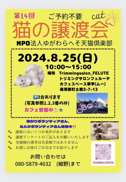 | イベント内容 | 神奈川県湯河原町、駅から海に向かって歩いた郵便局の裏手で譲渡会を開催します。 湯河原町真鶴町で生まれ保護された猫ちゃん達が参加します。預かりスタッフから普段の様子や気になることをじっくり問い合わせながらゆっくり見ていただけます。是非新しい家族になってください。子猫も沢山参加予定です。 私達と一緒に活動してくれるボランティアさん募集中です。 預かりボランティア、ミルクボランティア、元気なシニアボランティアさん、DIYが得意な方、力仕事のお手伝いをして下さる方。是非様子を見に来て下さいね。 |