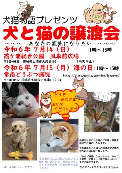 | イベント内容 | いつも開催している霞ヶ浦総合公園、ジョイフル本田様に続き新しい場所での譲渡会です。 土浦の下高津にある。 常南動物病院さん。素敵な病院です。どうぞ足をお運びくださいませ。 あなたとの出会いを待つワンニャンにぜひ会いにきてくださいませ。 11時~15時開催です ●犬猫物語は土浦を中心とし保護活動、野良猫の避妊去勢などを行っている団体です。 犬猫の相談などはお電話くださいませ。 譲渡会への猫の参加も受け付けております。 当日いきなりの参加は不可能ですが、事前にご連絡ください。 お待ちしています(^^ 問い合わせは09017673372鈴木まで。非通知には出ません。 #譲渡会 #里親会 #犬 #猫 #常南どうぶつ病院 #犬猫物語 |