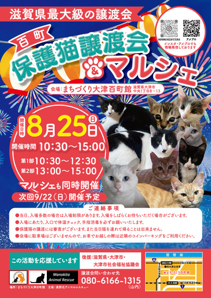 | イベント内容 | 滋賀県最大級の保護猫譲渡会。 毎回40頭以上の猫さんが参加します。 初めての方でも安心して譲渡の安心サポートの譲渡会です。 予約不要、入場無料。 参加猫さんのご紹介は https://ameblo.jp/hyakucyojyoutokai または、Instagram @hyakucyoujyotokai をご覧下さい。 ※ 後援 滋賀県、大津市、大津市社会福祉協議会 |